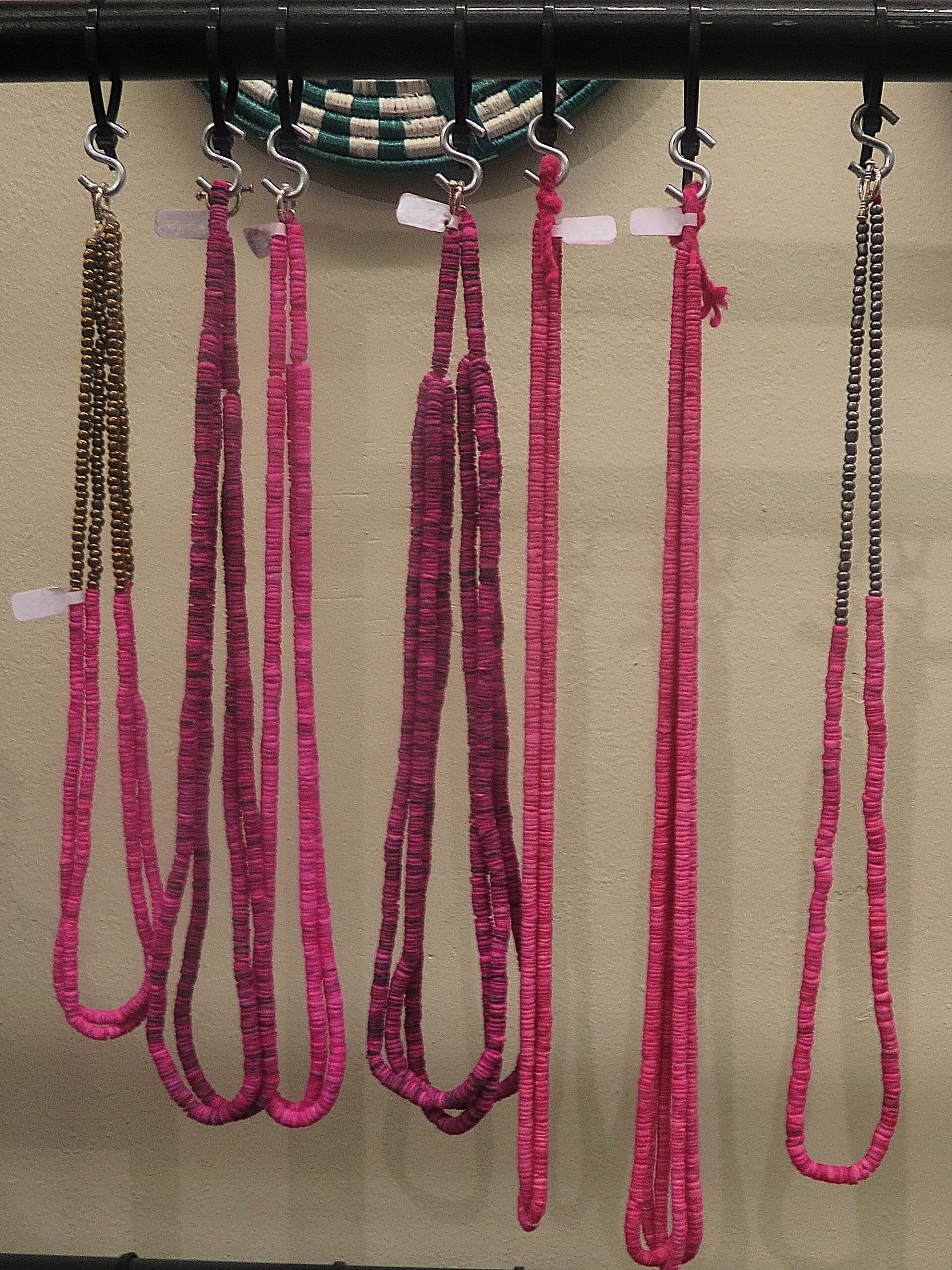 Traditional necklaces rooted in Ovambo culture. Crafted from natural shell. These beads are shaped into small discs and dyed pink. They carry cultural craft into easy, everyday adornment. Available in different styles.