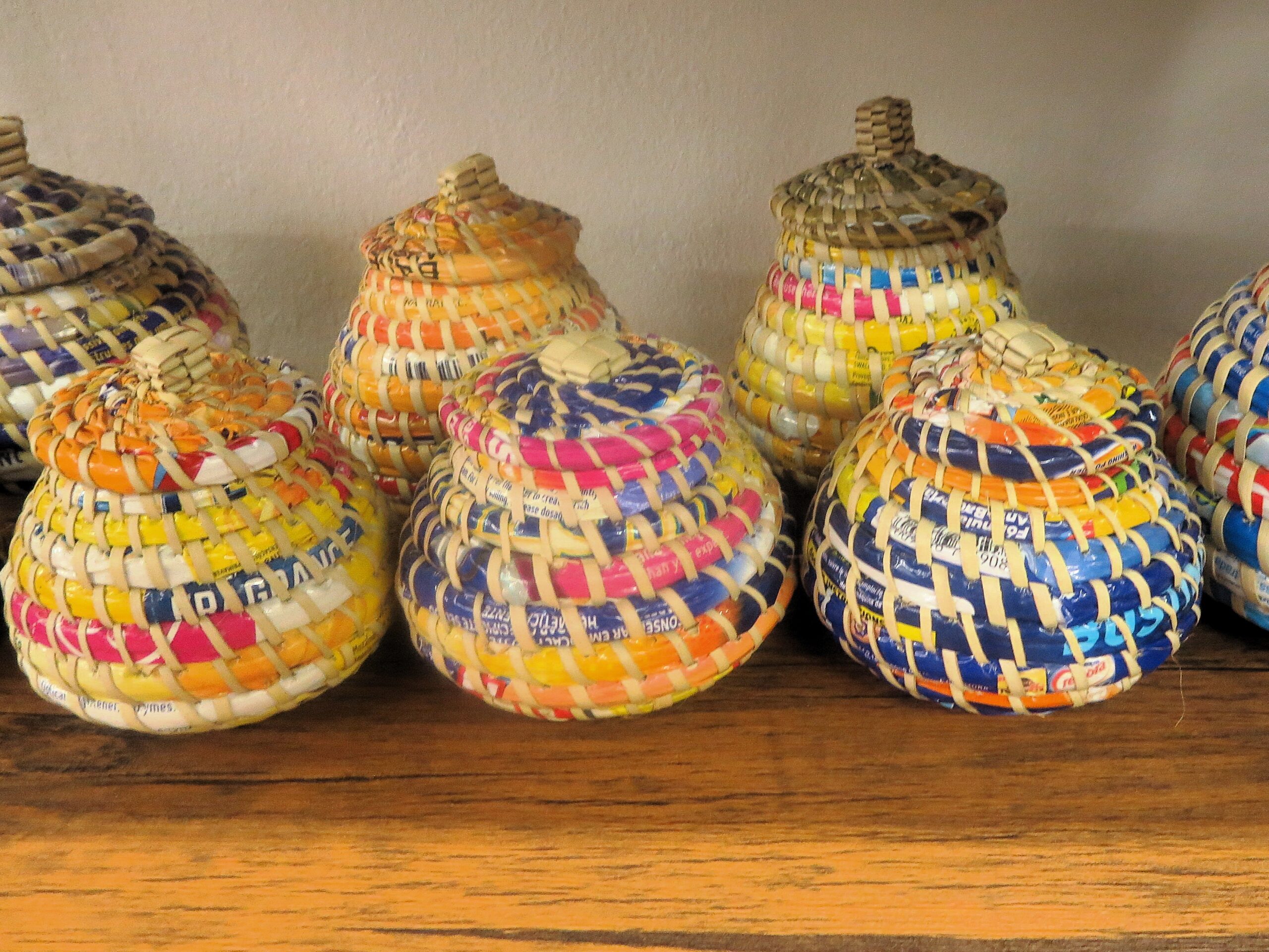 Handwoven lidded baskets crafted from recycled plastic packaging, offering a compact and eco-conscious solution for organising your trinkets.